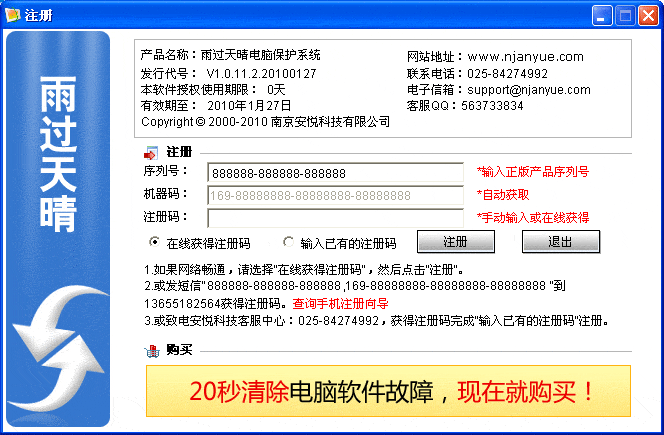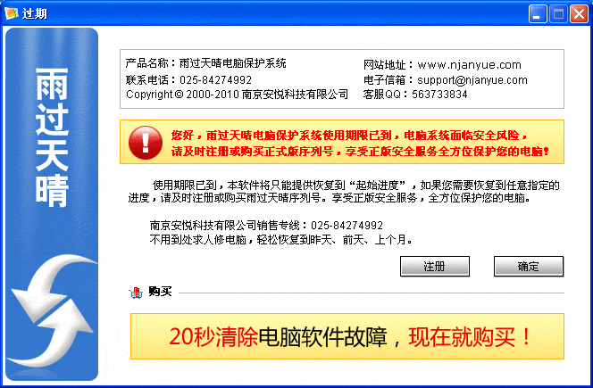 | 1、双击电脑右下角任务栏上雨过天晴图标 1)如果序列号使用时间过期,弹出图1“过期”界面,点击图1中“注册”按钮,弹出图2“注册”界面; 2)如果序列号使用时间没过,直接弹出图2“注册”界面。 |